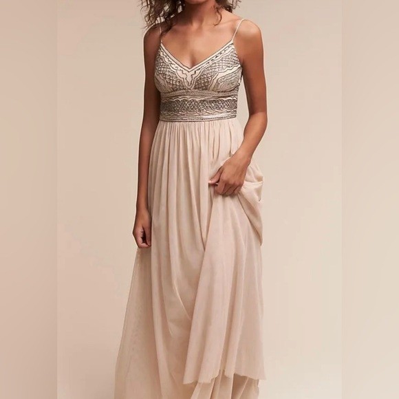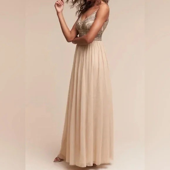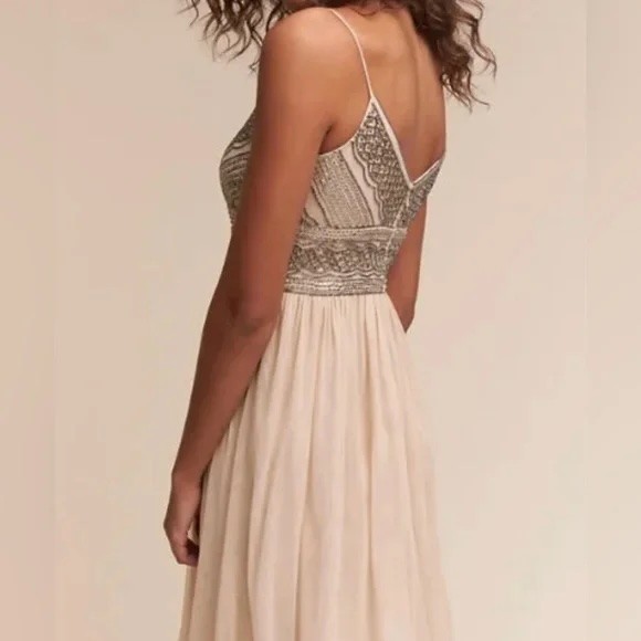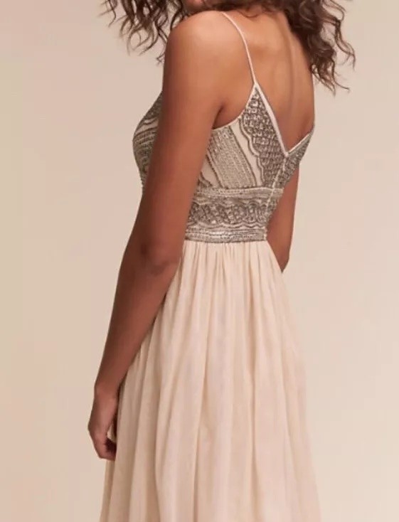 Vestido Adriana Papell color beige con piedras en pechoy espalda de tirantes de tela chifon talla 4 (XS)