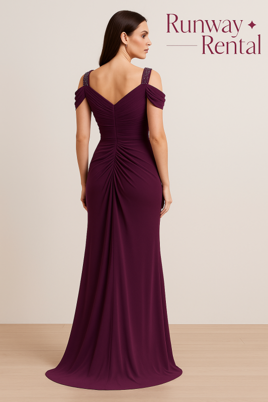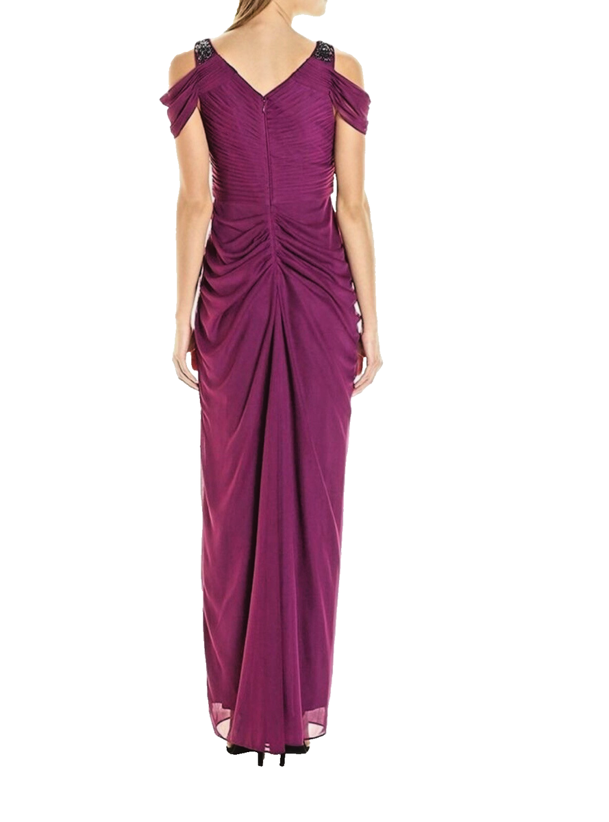 Vestido Adriana Papell color morados, de tirantes y mangas caidas recogido a un lado y plisado en busto y espalda.talla 14 (L)