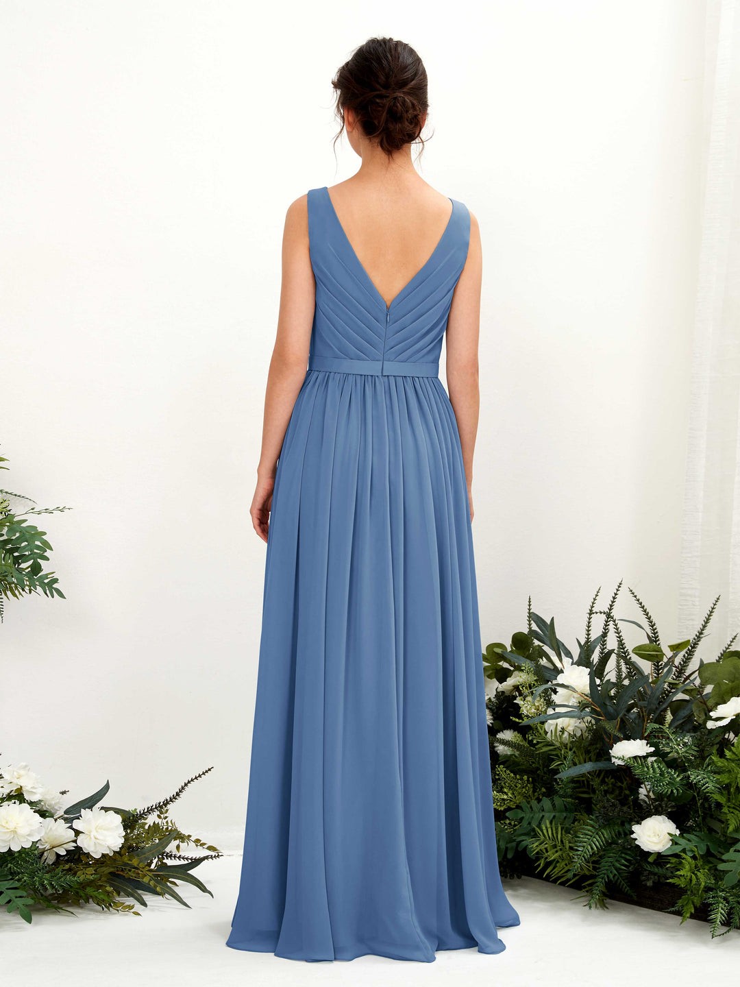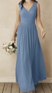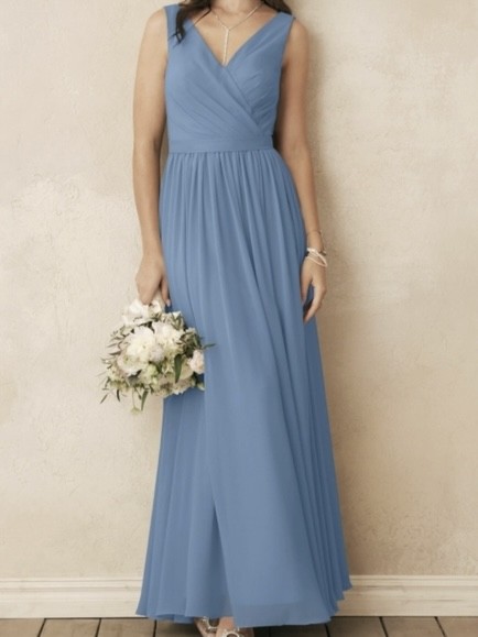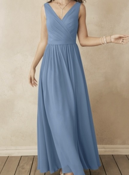 Vestido AW Bridal color azul arena cuello en V con cintillo a la cintura talla 14 (L)