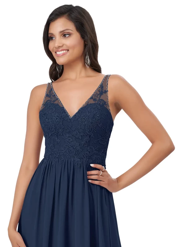 Vestido Azazie, color azul Neptuno oscuro con encaje en la parte superior.
