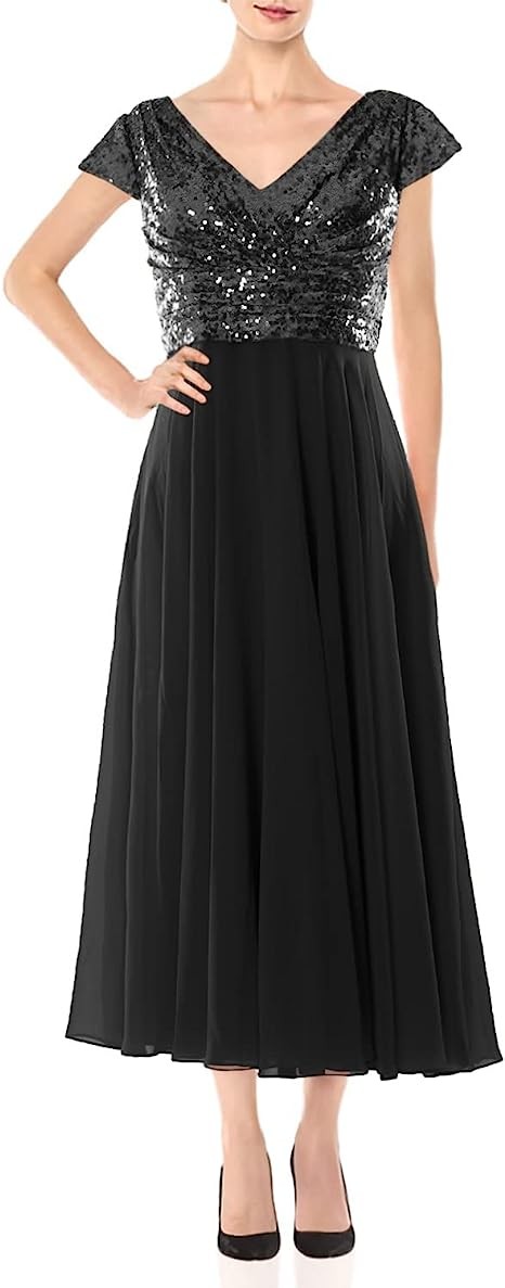 Vestido azul marino, con lentejuelas en la parte superior en un decorado con pliegues cruzados y falda tipo A arriba de la rodilla.