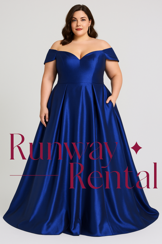Vestido Azul Marino tipo princesa, hombros caídos.