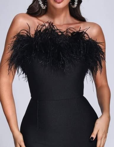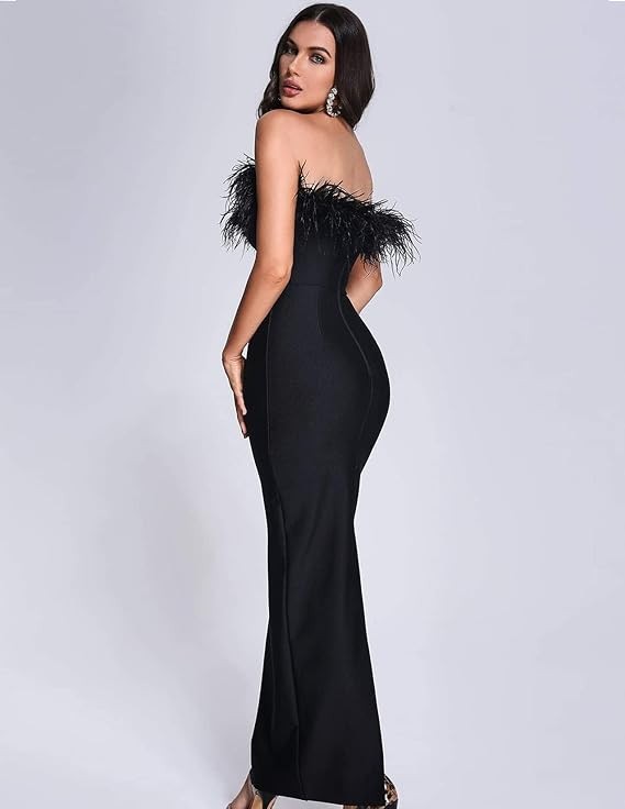 Vestido BELLA BARNETT Color negro, largo de plumas, vestido de corsé sin espalda, sexy con cola de pez