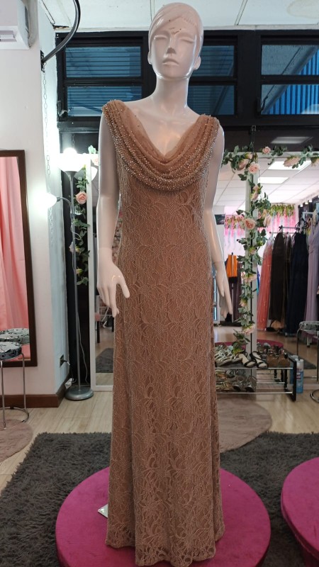 Vestido Cachet Talla 8 beige con piedras y cuello con vuelo tipo sirena