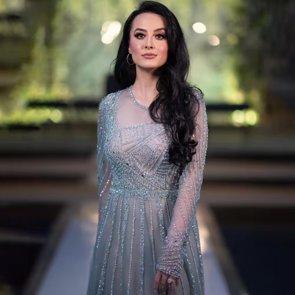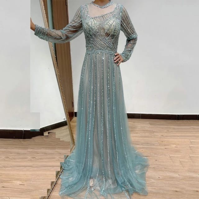 Vestido color acua de piedreria y tul en el torso y mangas largas talla 18 (XX)