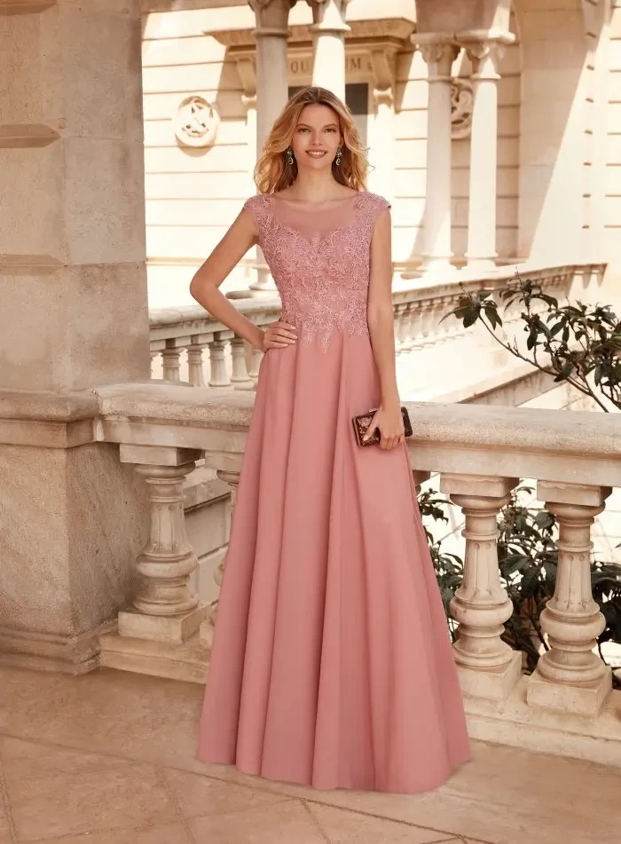 Vestido color Nude con encaje en el pecho hasta la cintura, tul en el cuello y falda con pliegues.