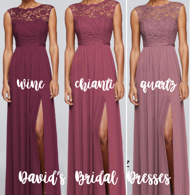 Vestido David Bridals color corinto con encaje en la parte superior y fruncido delante y atras