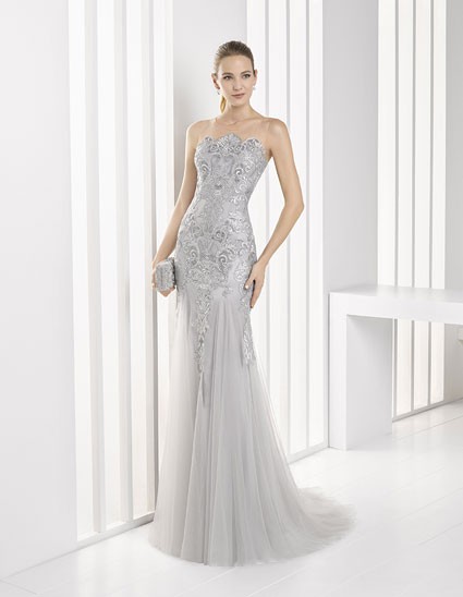 Vestido Gris de Tul con pedrería fina, Marfil.