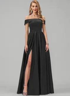Vestido JJs House Negro de satín, Tipo A, abierto en la pierna, falda plisada.