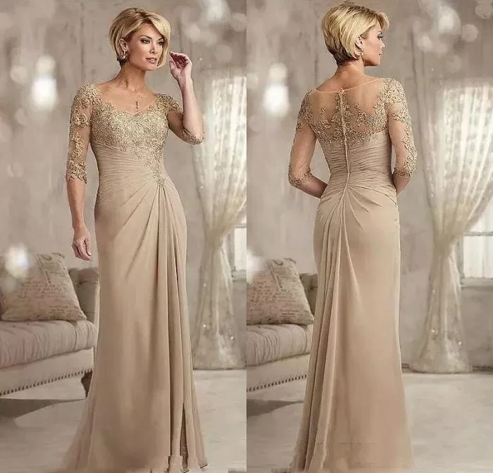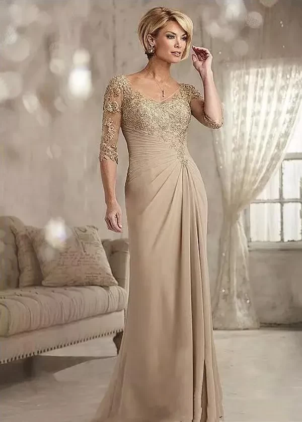 Vestido Lanting Bride, beige de encaje con mangas y fruncido en frente.