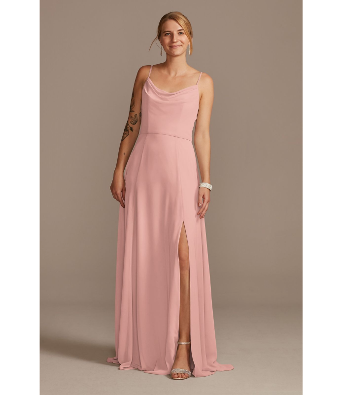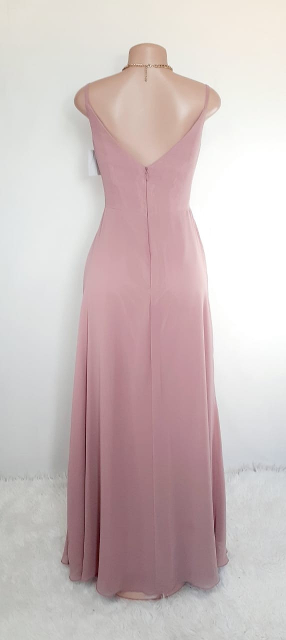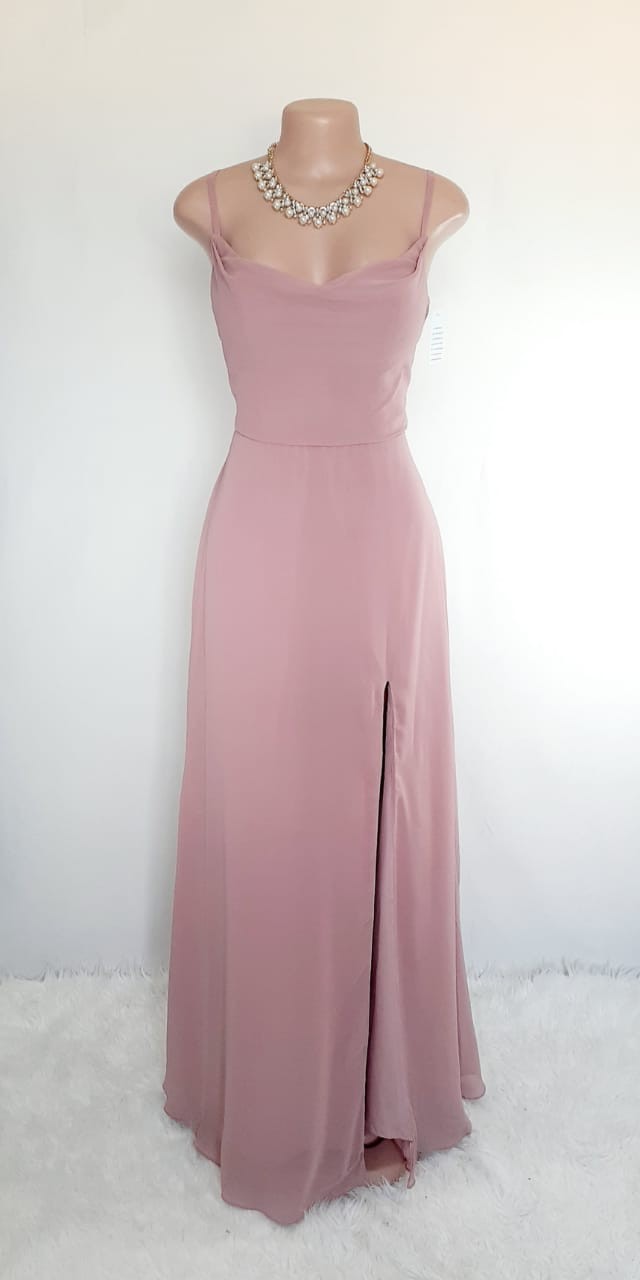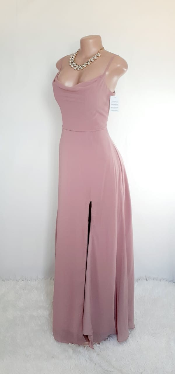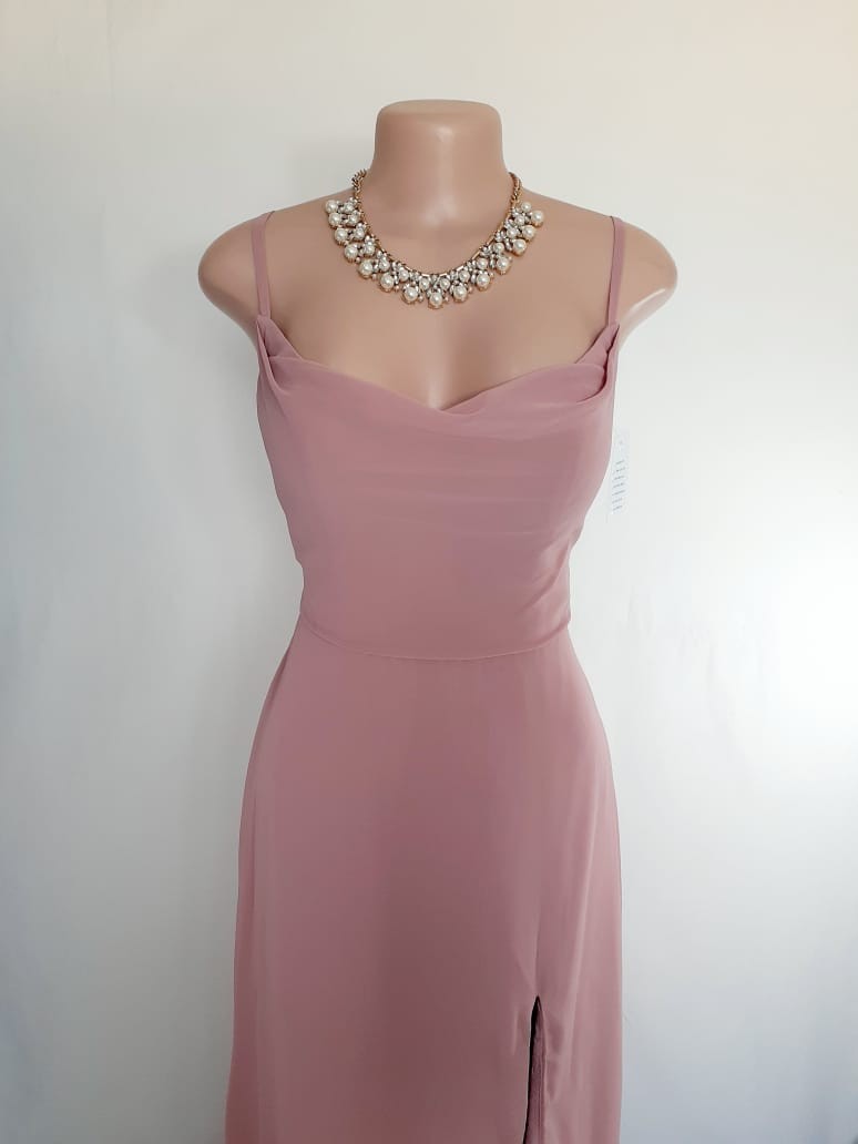 Vestido largo rosa, con escote columpio y abertura en pierna