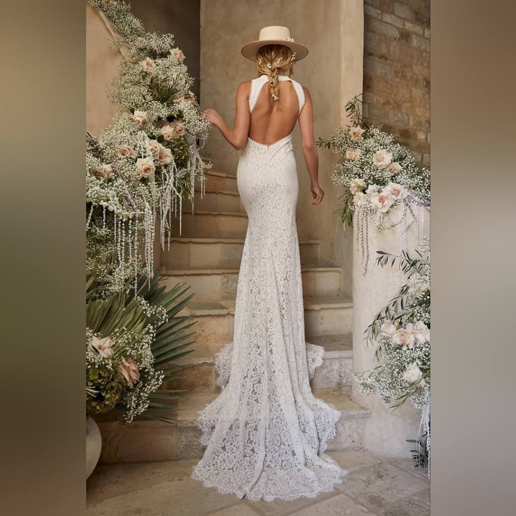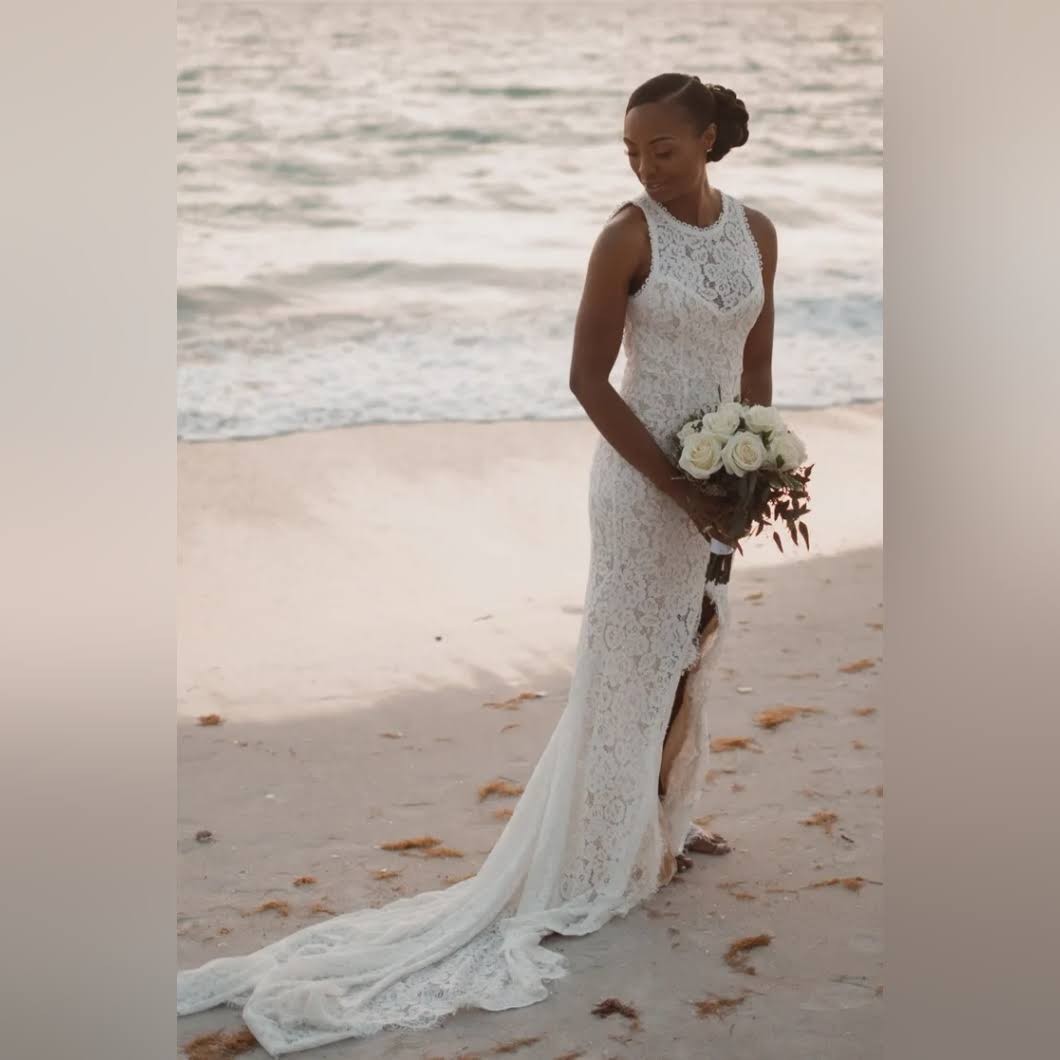 Vestido Lulus Blanco Hueso de encaje con cola y abierto enfrente.