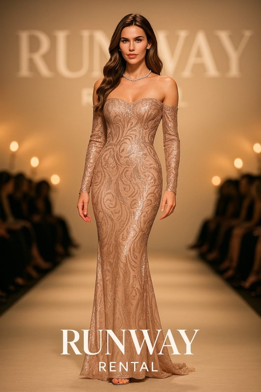 Vestido Miss Ord dorado de lentejuelas tipo sirena hombros afuera manga larga talla 6