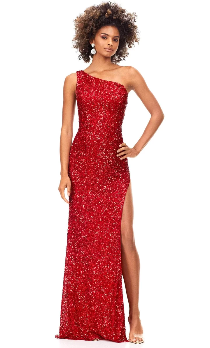Vestido Moda color rojo de lentejuelas hombro afuera y abertura en la pierna