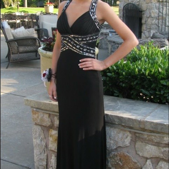 Vestido Morgan & Co negro decorado con piedras en el pecho y espalda. Cruzado en la espalda con escote hasta la cintura.