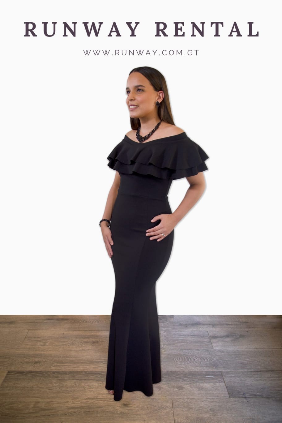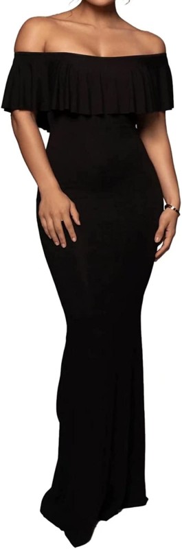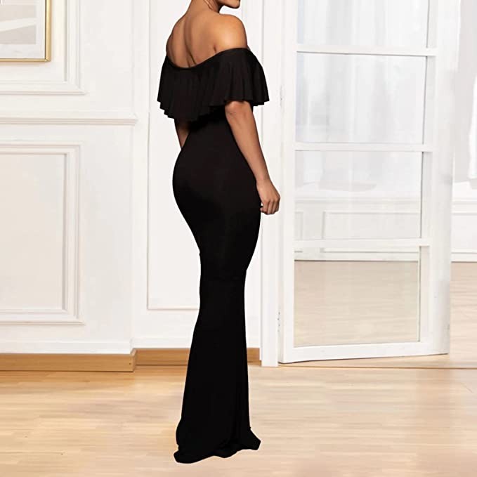 Vestido negro largo strech de fiesta, con volantes vintage.