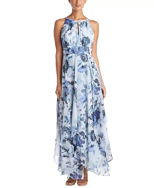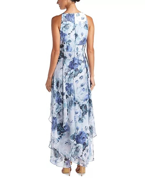 Vestido R&M de celeste con blanco y flores azules y moradas con vuelos en la falda, plisado en la cintura y pecho, tipo halter