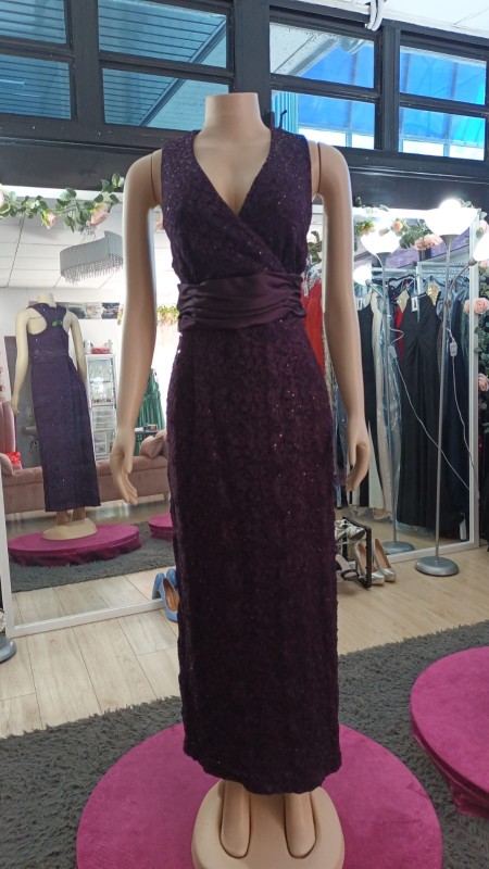 Vestido R&M richard color morado con tele de encaje con brillante talla 16