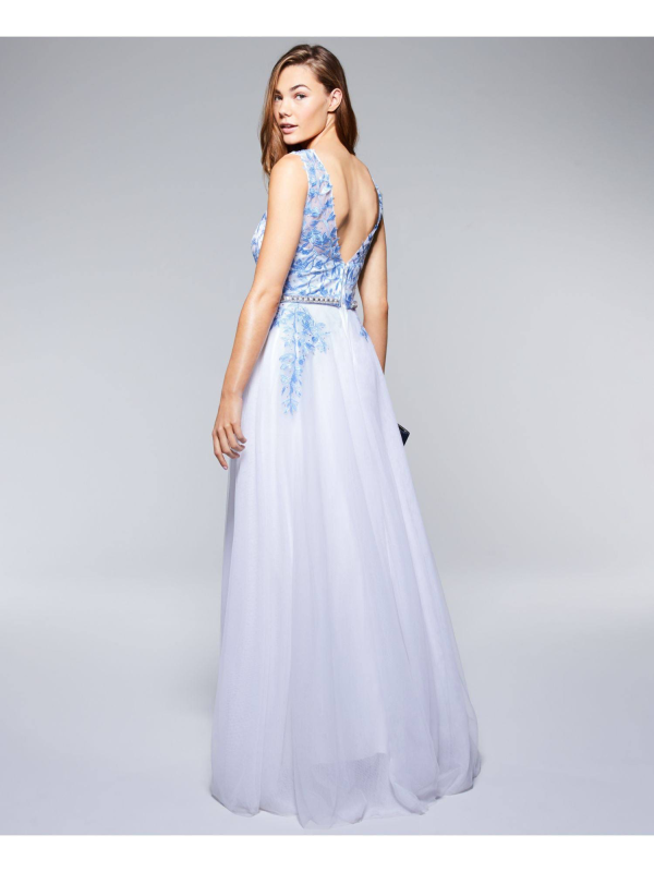 Vestido Say Yes To The Prom Talla 4 Blanco con apliques azules y cinturon de piedras con cuello en V sin mangas y bordado de color marfil