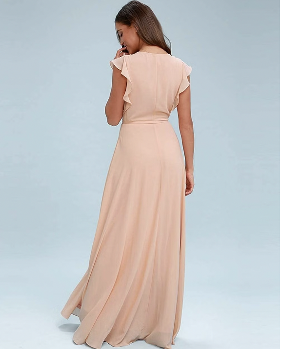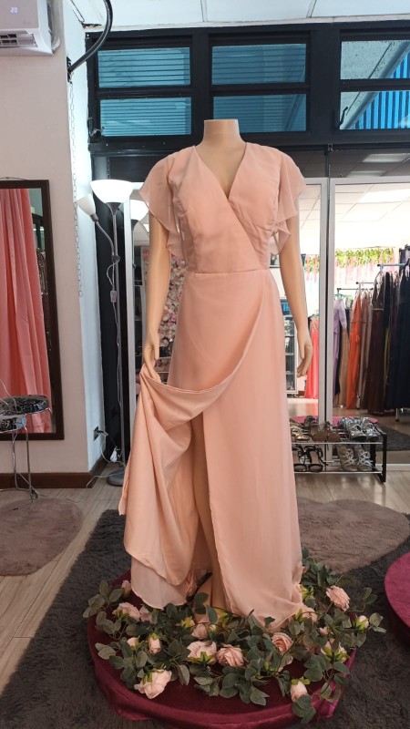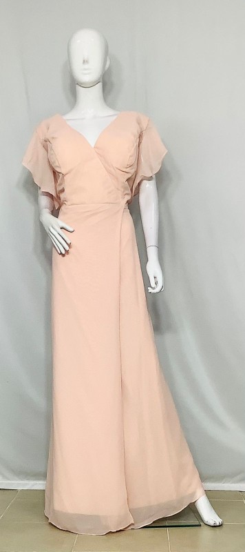Vestido Style Fun de seda, color salmón grecia, cob manga de vuelo, abierto adelante.