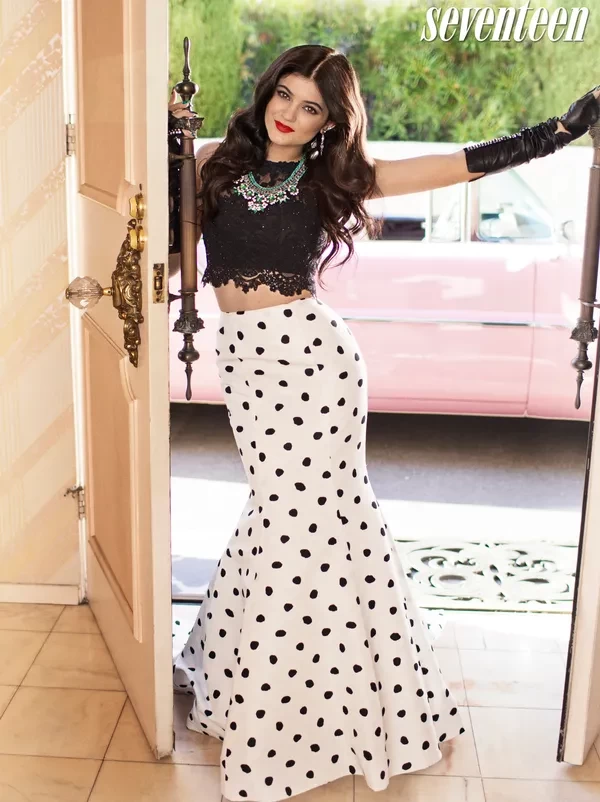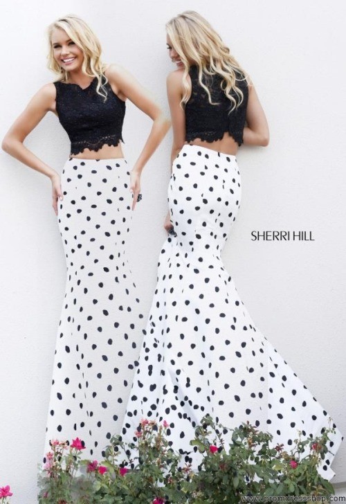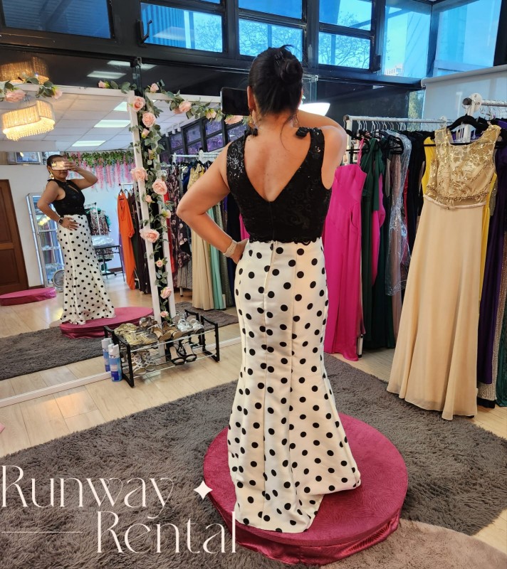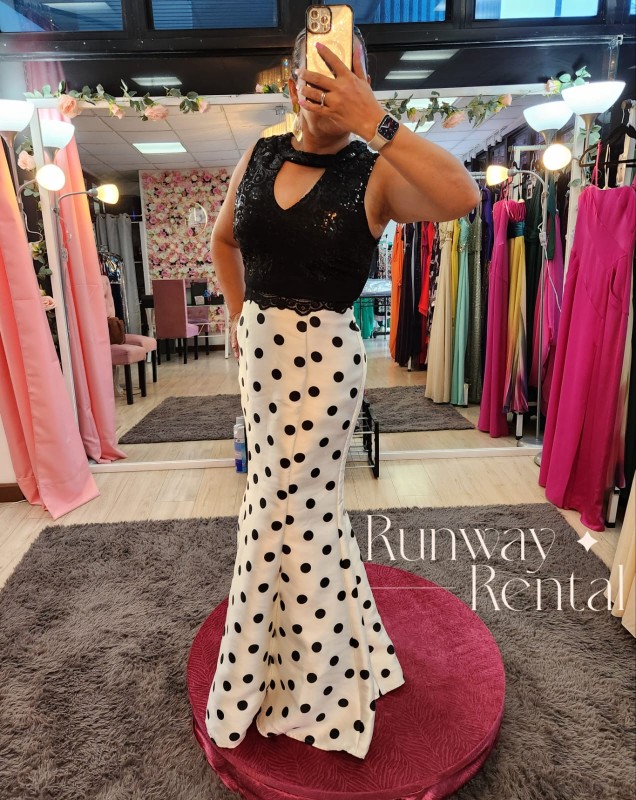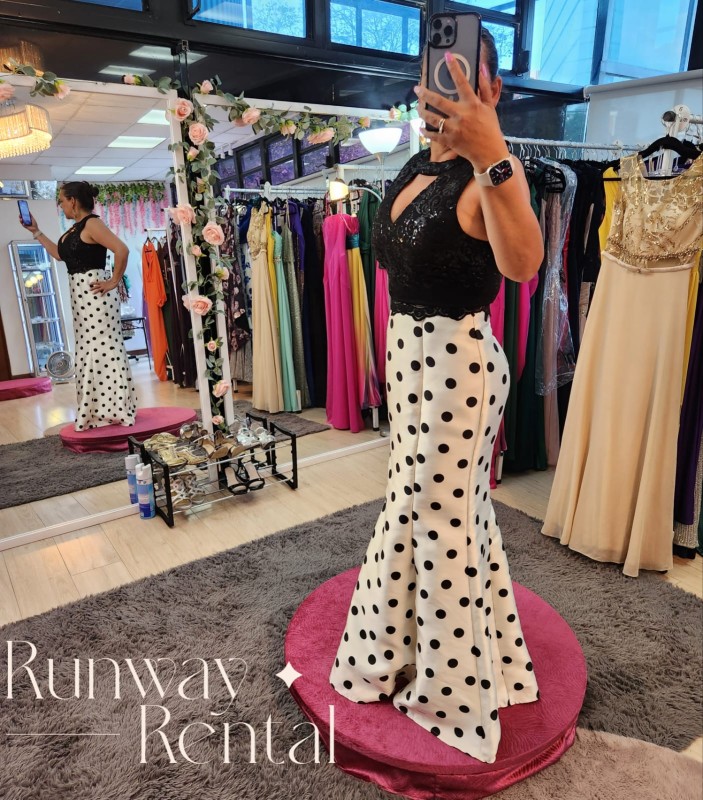 Conjunto Falda y crop top negro y falda Blanca con puntos negros, corte Sirena Talla 8 (S)