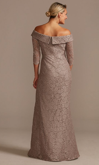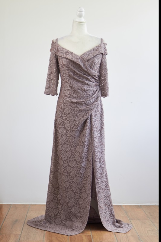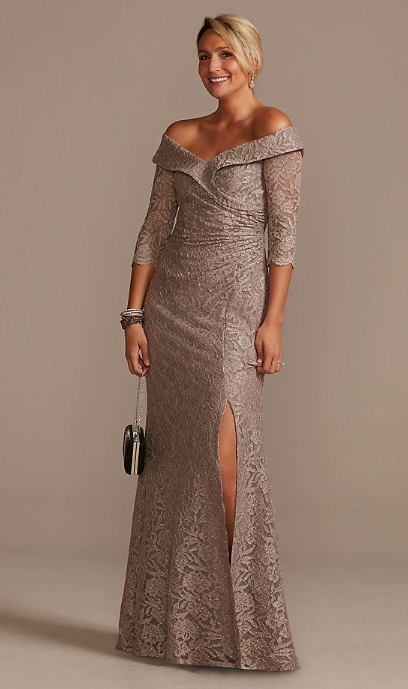 Off-the-Shoulder V-Neck Ruched Lace Gown