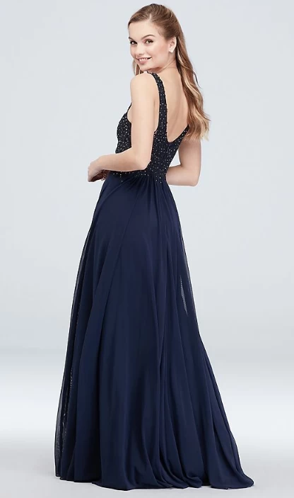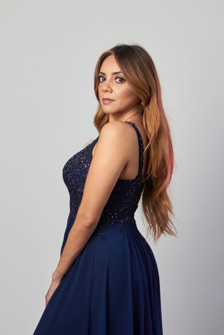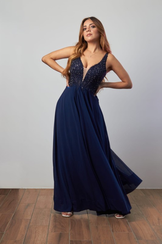 Color: Azul Marino, con aplicaciones florales, transparencia en V y detalles de gemas forman este elegante vestido de noche.