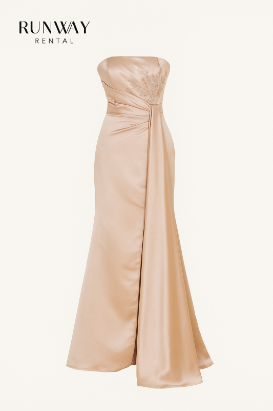 Vestido elegante para dama, color beige, hombros afuera