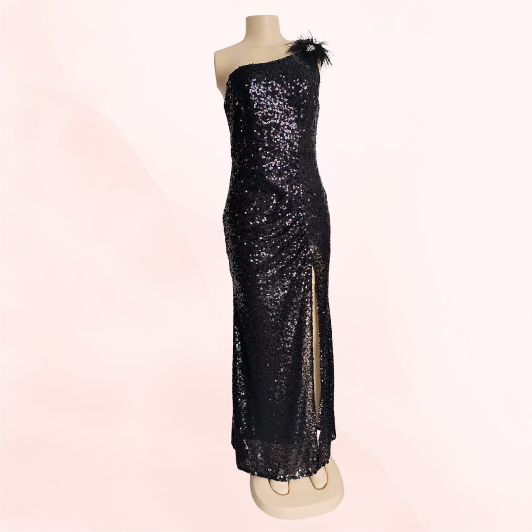 Vestido hombro afuera y abertura en la pierna, confeccionado en lentejuelas.