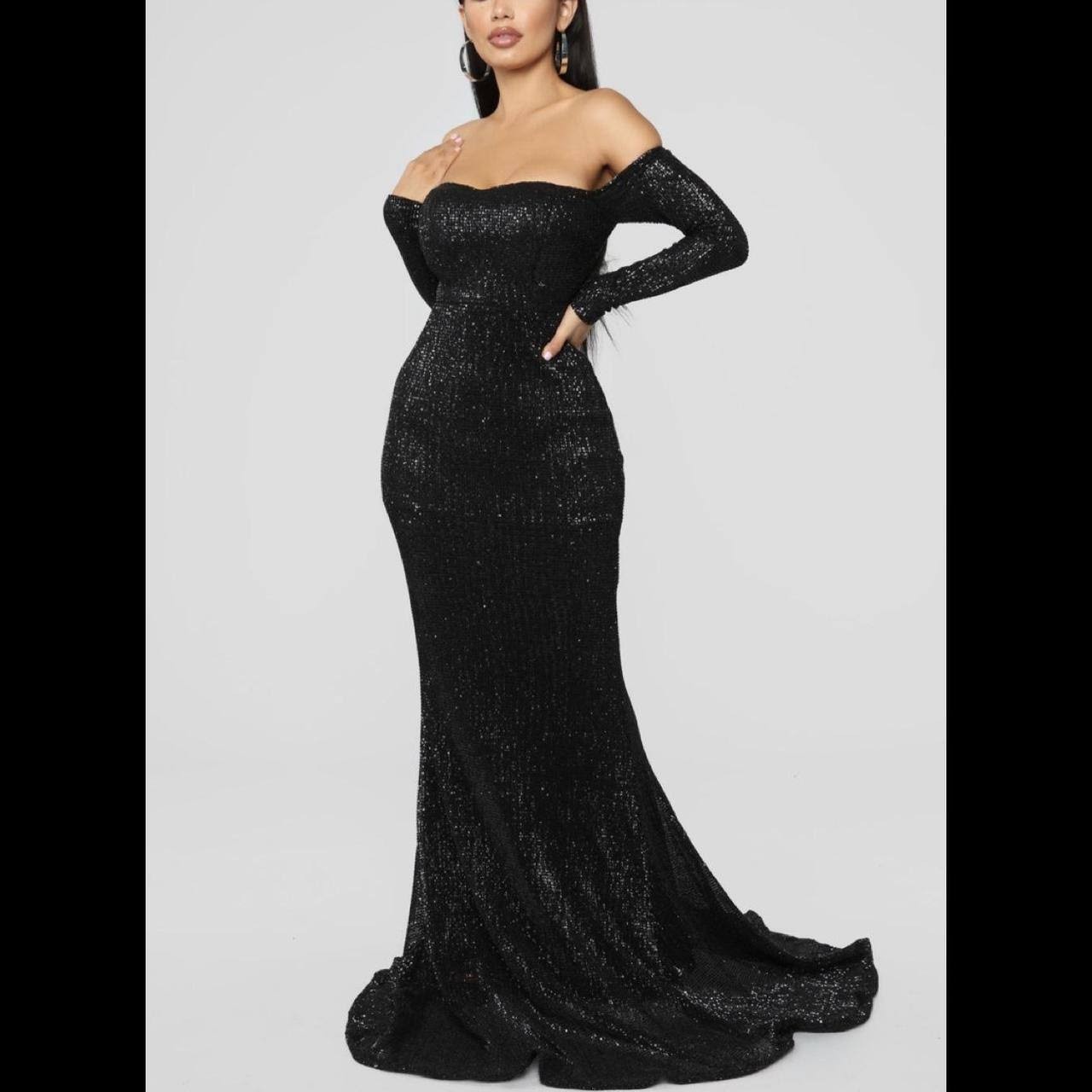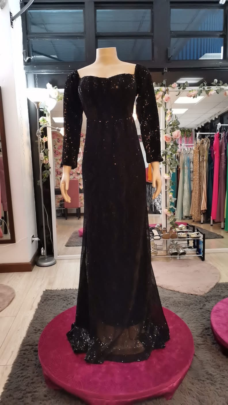 Vestido negro con lentejuelas, hombros afuera, mangas largas, tipo sirena