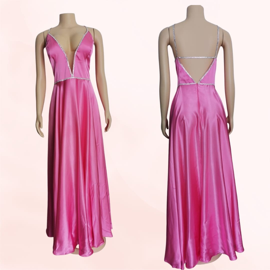 Vestido Rosado con bordes de piedras plateadas tipo A