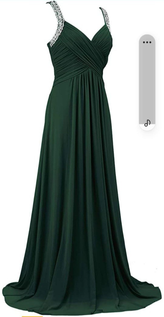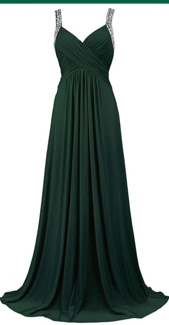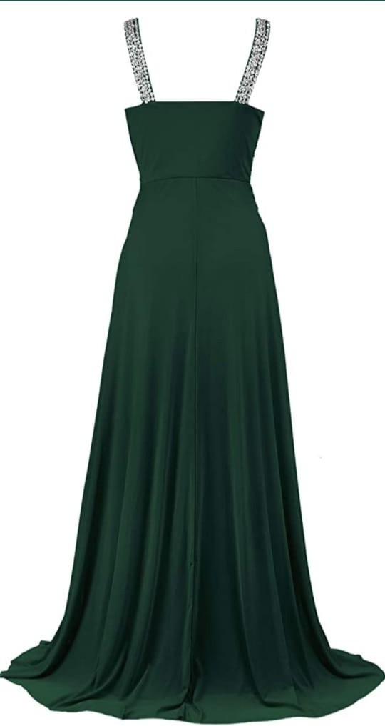 Vestido verde esmeralda, Tipo A, con piedras en los tirantes, vaporoso.